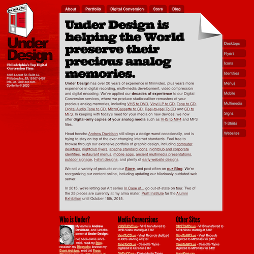 Under Design is a Philadelphia, PA based multi-disciplinary firm that has archived old web design work to this domain (undr.work), mostly to avoid deep web crawlers from discovering bad links and annoying reports of dead ends. These local versions contain (hopefully) inoperable forms and the occasional missing pages and images from some of our retired domains and services.
