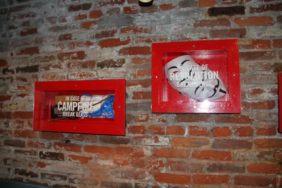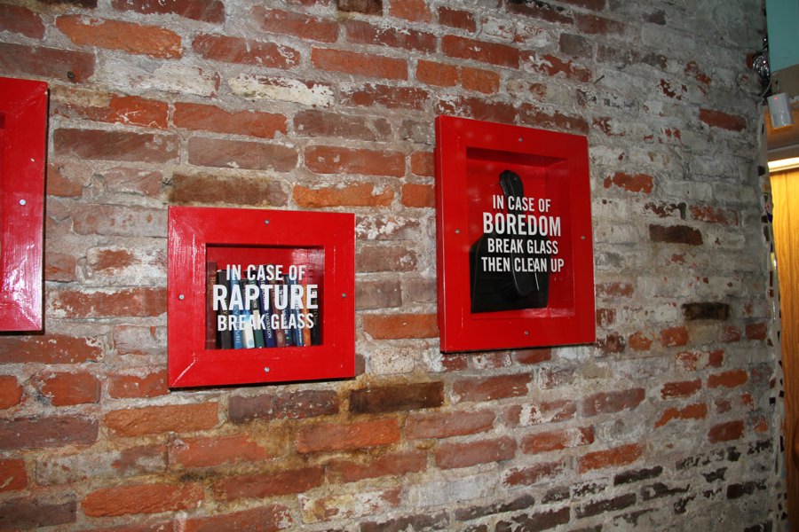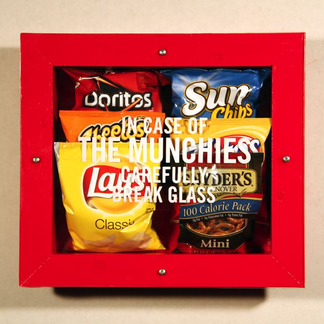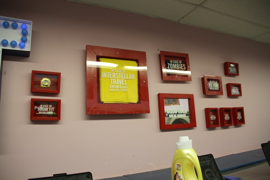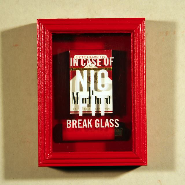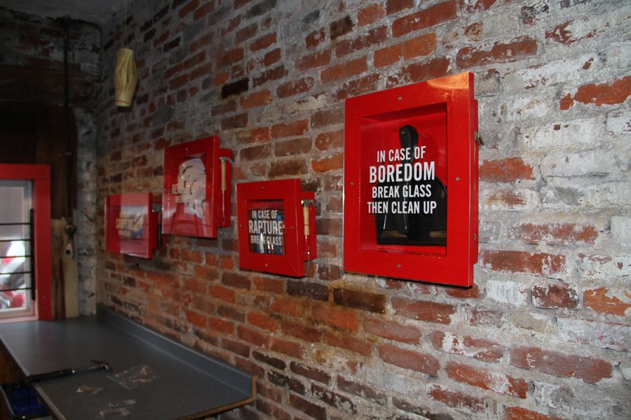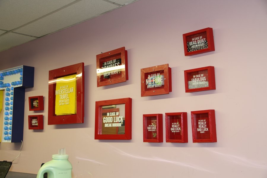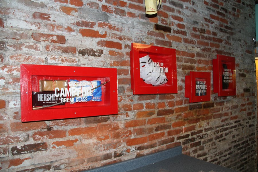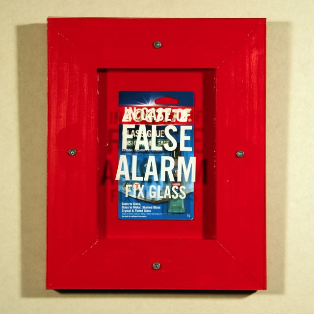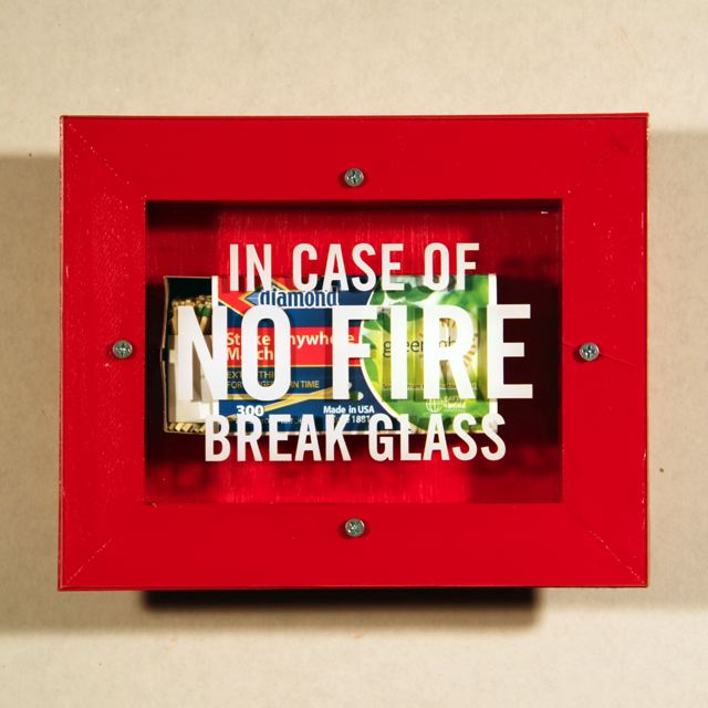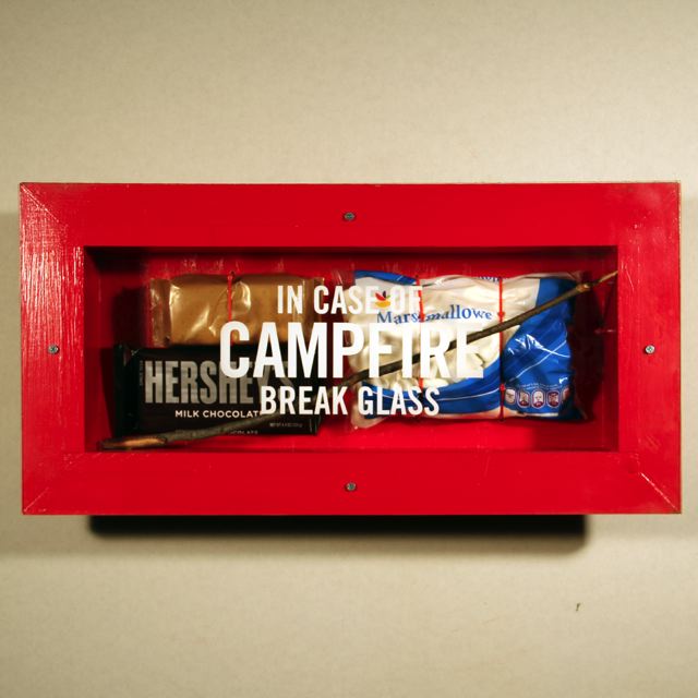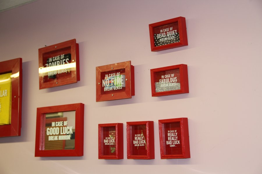 Each unit is made of pine wood, red acrylic paint, vinyl lettering, polystyrene plastic, and assorted bolts and contents (mostly plastic, including the real-looking but ultimately fake gun). Some of the larger units also have themed 'glass breakers' on the side of the unit, adding an extra bit of for the superbly curious.