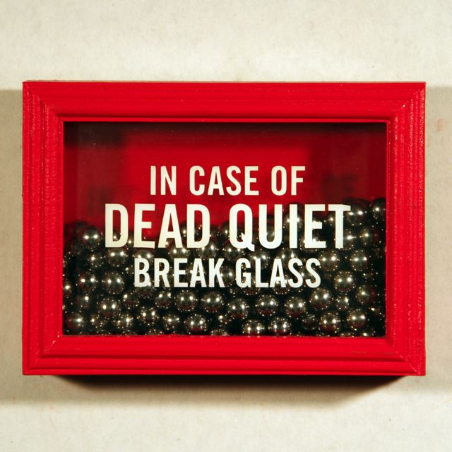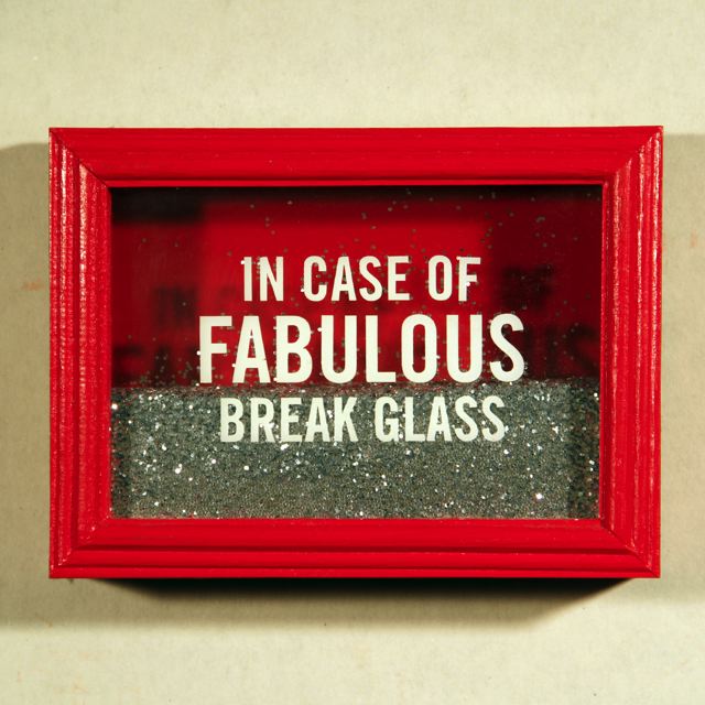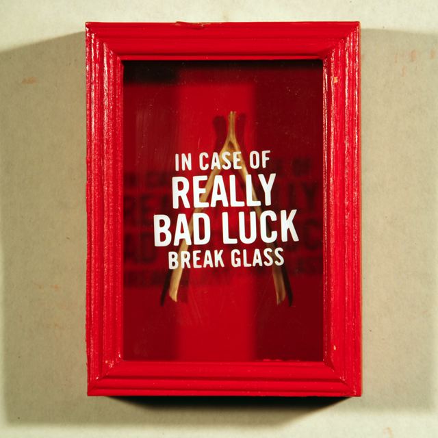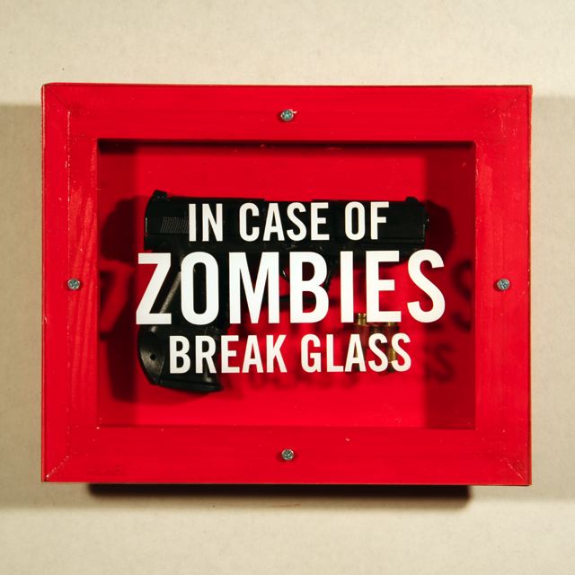 The current emergencies that can be solved by simply breaking some glass include: Boredom (Dustpan & Broom), Fabulous (Glitter), Sugar Fit (Lollipops), Dead Quiet (Metal Marbles), Miracle (Condom), Revolution (Guy Fawkes Masks), Rapture (Religious Texts), Zombies (Handgun, 2 Bullets), No Fire (Box of Matches), Interstellar Travel (Towel), Campfire (S'more's Ingredients, Whittled Stick), Good Luck (Mirror), Bad Luck (Four-Leaf Clover), Very Bad Luck (Wishbone), Very Very Bad Luck (Empty). Recently added, but not shown include: Oversleeping (Alarm Clock), Love at First Sight (Single Red Rose), Printer Jam (Baseball Bat) and Dark Sith Lord (Lightsaber).