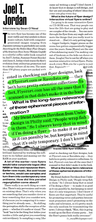 - Joel talks about his new book, Searching for the Perfect Beat : Flyer Designs of the American Rave Scene, and pushes my flyer design web site FlyerArt.