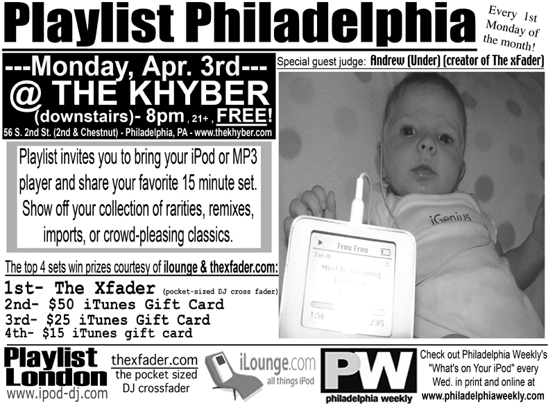 Not only is the xFader the first prize at Monday April 3rd's Playlist Philadelphia event, but Under will be judging. Click the flyer to zoom in.
